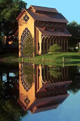 The Baughman Center consists of two buildings located along Lake Alice on the University of Florida campus. The main building is a 1,500-square-foot (140 m2) nondenominational chapel or pavilion, while the other one is an 1,000-square-foot (93 m2) administrative building. The chapel has seating for 96 people and is used for silent meditation, private contemplation, weddings, funerals and memorial services as well as a venue for small musical or performing arts events.[1] The center, named after George F. Baughman and his wife, Hazel Baughman, the benefactors of the project and is considered an oasis of calm and beauty on the bustling campus.[2] On April 18, 2012, the American Institute of Architects's Florida Chapter ranked the Baughman Center third on its list of Florida Architecture: 100 Years. 100 Places.[3]