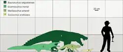 Baurusuchus is the type genus of the family Baurusuchidae, a family consisting of crocodilians with elongated and laterally compressed skulls.[4] Other members of that family from the Cretaceous of South America include Stratiotosuchus and Cynodontosuchus, but baurusuchids are also known from the Cretaceous of Asia (Pakistan) and the Tertiary of Europe.[5]
