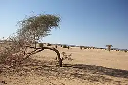 The Bayuda Desert, located at 18°N 33°E / 18°N 33°E, is in the eastern region of the Sahara Desert, spanning approximately 100,000 km2 of northeast Sudan north of Omdurman and south of Korti, embraced by the great bend of the Nile in the north, east, and south and limited by the Wadi Muqaddam in the west. The north-to-south-aligned Wadi Abu Dom divides the Bayuda Desert into the eastern Bayuda Volcanic Field and the western ochre-colored sand-sheets scattered with rocky outcrop.[1]