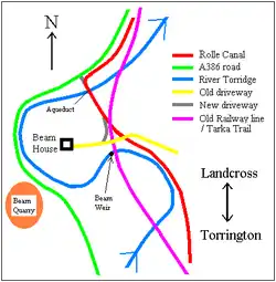 Beam is a crossing-point of several lines of communication. Map of environs of Beam House. Henry Williamson made several references to Beam in his 1927 novel Tarka the Otter including the following descriptive passage: "A quarter of a mile below Rothern Bridge the river slows into the lower loop of a great S. It deepens until half-way, where the S is cut by the weir holding back the waters of the long Beam Pool. Canal Bridge crosses the river at the top of the S"[2]
