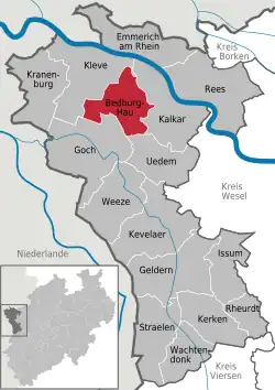 Bedburg-Hau is a municipality in the district of Kleve in the state of North Rhine-Westphalia, Germany. It is located approximately 5 km south-east of Kleve.