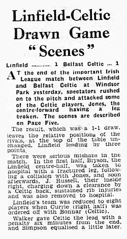 The catalyst for the end of the club came on 26 December 1948, at the traditional Boxing Day league game between Linfield and Celtic at Windsor Park. Celtic were winning for most of the match but Linfield equalised in the final minute. Ecstatic Linfield fans invaded the pitch and began attacking several Celtic players, including centre-forward Jimmy Jones, who suffered a broken leg and was kicked unconscious, and Robin Lawlor and Kevin McAlinden, who were both seriously hurt.[8][9]