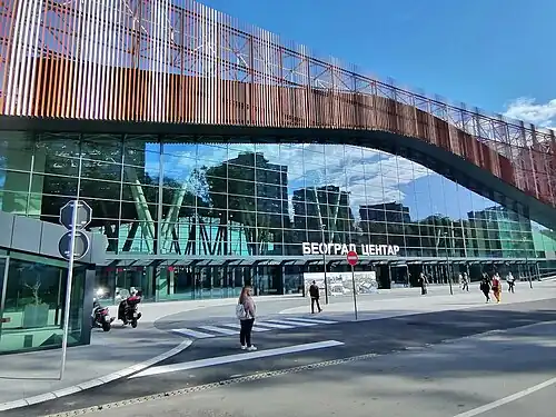 Belgrade Centre station was opened on 26 January 2016,[7] serving two daily trains to Novi Sad, as well as BG Voz, Belgrade's commuter railways..[8] Following gradual re-routing, it gained its current role on 1 July 2018.[9] Today, the station links Belgrade to Vršac, Sremska Mitrovica,[10] Šid, Valjevo, Požega, Užice, Niš, the Montenegrin cities of Podgorica[11] and Bar, as well as Novi Sad via a high-speed intercity route and other cities.[12] It is also served by the primary variations of BG Voz's lines 1, 3 and 4.[13]