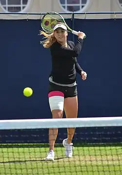 Bencic struggled in the first half of 2015. Through the French Open at the end of May, she won multiple matches in the same event only twice, reaching the fourth round at both the Indian Wells Open and the Miami Open.[13] At Indian Wells, she notably won a match against No. 5 Caroline Wozniacki, the highest-ranked player she had ever defeated at the time.[36] Bencic lost in the opening round at the Australian Open and the second round at the French Open.[13] She began to turn her year around during the grass-court season. In the lead-up to Wimbledon, she made her second and third career WTA finals. After finishing runner-up to Camila Giorgi at the Rosmalen Championships,[37] she won the Eastbourne International over Agnieszka Radwańska for her maiden WTA title.[38][39] Bencic then improved on her previous year's result at Wimbledon by reaching the fourth round.[40]