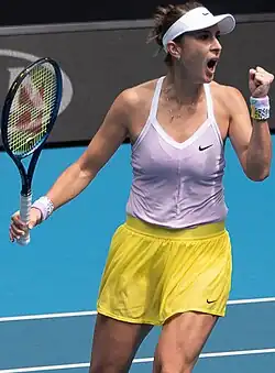 Despite being back outside of the top 50, Bencic had a strong start to 2019. She reached the semifinals at the Hobart International and made it to the third round at the Australian Open, losing to eventual finalist Petra Kvitová.[66][67] Her next breakthrough came at the Dubai Championships. As an unseeded player, she defeated four top-ten players in the last four matches to win her third WTA singles title and second at the Premier 5-level. In order, she recorded wins over No. 9 Aryna Sabalenka, No. 2 Simona Halep, No. 6 Elina Svitolina, and No. 4 Petra Kvitová, all in three sets and two of which in a final set tiebreak.[68] The title helped her rise to world No. 23.[24] Bencic continued her win streak with a semifinal appearance at the Indian Wells Open. She defeated two more top-ten players in No. 1, Naomi Osaka, and No. 5 Karolina Plíšková before losing to No. 8, Angelique Kerber.[69][70] In the lead-up to the French Open, Bencic produced another Premier Mandatory semifinal at the Madrid Open. She recorded another world-number-one win over Osaka,[71] but could not defeat Halep in a tight three-set match.[72] After the tournament, she moved up to No. 15.[24] At the French Open, she advanced to the third round for the first time, where she was defeated by No. 24 Donna Vekić. During the grass-court season, Bencic made her second WTA final of the year at the Mallorca Open. After defeating top seed and world No. 6 Kerber,[73] she finished runner-up to Sofia Kenin, after having three match points in the second set.[74] Like at the Australian Open and the French Open, she lost in the third round at Wimbledon.[75]