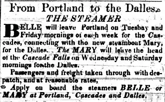 Passengers headed up river would disembark at the lower Cascades, travel on the portage road along the north bank, and then board the sidewheeler Mary upriver to the next head of navigation, The Dalles. Freight charges were high, $50 a ton on cargo from Portland to The Dalles, but Belle and Mary still could not handle the demand, and other steamers came on the routes, driving rates down to $30 a ton.[2][3][5]