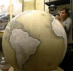 Originally made from hemispheres of plaster of Paris glued together,[19] the company's small globes are now made from resin and the larger from composite materials.[20] The company employs three cartographers and uses a modern map of their own design that customers are invited to customise. The maps are printed onto paper gores and cut by hand. The paper is wet and stretched across the sphere before being hand painted and finished with a matte or gloss finish.[20] The globes are weighted so they come slowly to rest when spun.[19]
