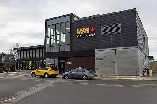 On November 10, 2010, Via Rail unveiled a design for a contemporary CA$18 million station building which would be wheelchair accessible with space to accommodate expanded track lines.[10] Built at 250 Station Street, adjacent to the historic station, the new facility accepted its first passengers on March 20, 2012. MP Daryl Kramp officially opened the station on September 12, 2012.[11]