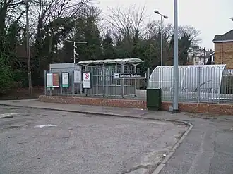 Belmont railway station serves the village of Belmont in the London Borough of Sutton in south London. The station is located on the Epsom Downs line and is in Travelcard Zone 5. It is 16 miles 1 chain (16.01 miles, 25.77 km) down the line from London Bridge measured via West Croydon.[3] It is the closest station to the Royal Marsden Hospital, which is just under half a mile away. On 19 January 2023, Sutton Council were granted £14,121,979 from the government to add a turnback siding to the south of the station to increase capacity to let services run at 4 tph instead of the current 2 tph service pattern.[4][5]