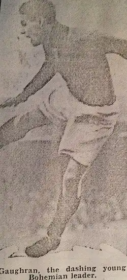 His Bohemian teammates included Harry Cannon, Plev Ellis, Fred Horlacher and Billy Jordan that season, and Gaughran was the top scorer with 15 goals in 21 league games.[4] In his 39 appearances that season in all competitions, he netted 32 times.[5] In 1936, Gaughran was part of the team who broke a record by winning the fifth league title of the free State League Championship by defeating Cork 4–1. Gaughran scored the third and fourth goals of the game.[6]