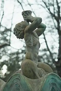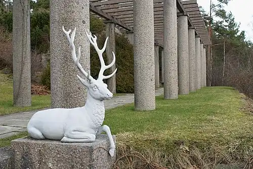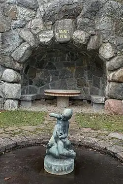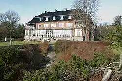 Berga Castle with associated buildings was built in 1913-15 by industrialist and art patron Helge Axelsson Johnson (1878–1941) according to drawings by architect Torben Grut (1871–1945).[4] The two-storey building is built of red brick and rests on a pedestal of granite. It is equipped with a säteri roof and has two towered wings towards the courtyard side. During Helge Axelsson Johnson's ownership there was a large hunting ground at Berga with, among other things, wisents. These animals were later transferred to his private facility in Avesta. Other animals included in the park were deer, roe deer, European badgers, foxes, hares and a variety of bird species. In the autumn it was traditional moose hunting and King Gustaf V and his company occupied their own wing at Berga. Thus Helge Axelsson Johnson became hovjägmästare and the building was upgraded to a castle.[5]
