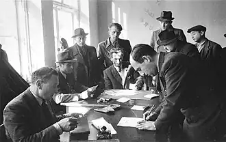 Jewish DPs sign documents for their departure to Mandatory Palestine, 1947