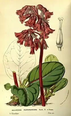 1. ^ a b "Bergenia purpurascens (Hook.f. & Thomson) Engl". Plants of the World Online. Board of Trustees of the Royal Botanic Gardens, Kew. Retrieved 8 April 2021.