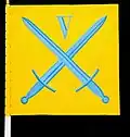 The coat of arms of the Bergslagen Military District Staff 1983–1991. Blazon: "Azur, an erect sword with the area letter (B - Bergslagen) surrounded by an open chaplet of oak leaves, all or."[1]
