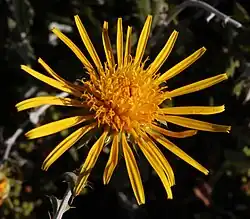 It is a perennial meso-chamaephyte that grows 15–25 cm high.[3] It has prickly leaves and grows dark yellow aster flowers.