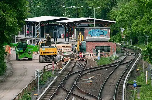 The western Yorckstraße (Großgörschenstraße) S-Bahn station on the S1 line (DS100: BGGS) was opened as Großgörschenstraße in 1891 with the new Wannseebahn rapid transit line running from Potsdamer Bahnhof to Wannsee. Originally located south of the small Großgörschenstraße the platform was demolished and shifted northwards to its current position at the Yorckstraße with the opening of the Nord-Süd Bahn tunnel in 1939. As the "Germania" plans included a general reorganization of Berlin's railway system, only a provisional station with wooden pillars was erected that nevertheless persists until today.