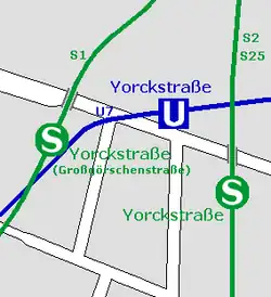 ![]() Yorckstraße (Großgörschenstraße) S-Bahn station, platforms and tracks | |||||||||||||||||||||||||||||||||||