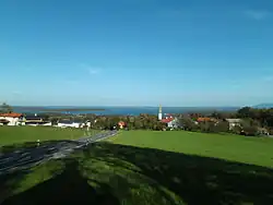 View of settlement Hittenkirchen and the lake Chiemsee with its islands Herrenchiemsee