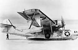 During 1940, with the "Little Norway" facilities under construction and his administrative duties taken over by others, Balchen requested permission from the Norwegian Air Force to fly ferrying missions for the British, teaming with Clyde Pangborn, a contemporary record-breaking pilot of the era.[18] In early 1941, while engaged in a ferrying mission, and on a layover in the Philippines, a representative of General Henry "Hap" Arnold sought out Balchen.[19] Arnold asked Balchen to join the US Army Air Forces as a colonel to oversee the establishment of the USAAF polar airfields at Thule, and Sondre Stromfjord, Greenland. These highly secretive bases would serve to ferry fighter aircraft across the Atlantic by air, rather than having to disassemble them and send them overseas by cargo ship.[20] The airfields also served as bases from which long-range Consolidated B-24 Liberator patrol aircraft could fly far out over the North Atlantic Ocean in search of the German Kriegsmarine U-boats that were menacing American, British, and Canadian ships taking war supplies and troops across the ocean in preparation for the then undecided location of the cross-channel invasion of Europe. This latter air base had the code name "Bluie West Eight" during its operational life.