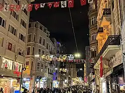 İstiklal Avenue is also located in the historic Beyoğlu (Pera) district. The famous street with shops, cafes, cinemas and other venues stretches for 1.4 kilometres (0.87 mi) and hosts up to 3 million people each day.[21]