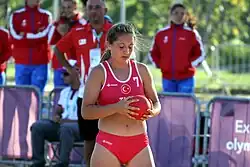 Beyzanur Türkyılmaz of Turkey women's national youth beach handball team at the 2018 Summer Youth Olympics.