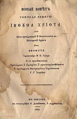 3. ^ The title page reads: “The New Testament of Our Lord Jesus Christ. Now newly translated from Slavic into Bulgarian language by Neofit, Ieromonah P.P. of Rila. And diligently examined and approved by the very consecrated and wise Metropolitan of Tarnovo, Illarion. In Smyrna. In the Press of A. Damianov and Company. 1840.”