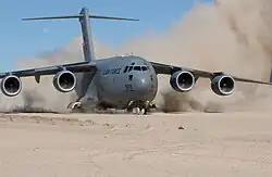 The jet engines of an Air Force C-17 Globemaster III kick up clouds of dust as the aircraft turns around at the end of a dirt runway at Bicycle Lake Army Airfield on Fort Irwin, Calif., on Feb. 10, 2006. The Globemaster and her crew are attached to the 452nd Air Mobility Wing.
