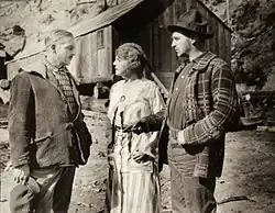 Lumberman Jack Fyfe (Reid, left) is interested in Stella Benton (Williams). She is the cook for her brother Charlie Benton (Paget, right) at the lumber camp in this still.