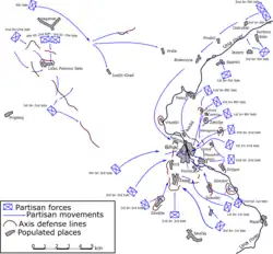 The movements of Yugoslav Partisan units towards Bihać began on 29 October. As they had to travel a significant distance, they marched during the night, through forests to remain unnoticed.[1] The attack on the city began on 9:30 p.m. on 2 November with the 1st Battalion of the 2nd Krajina Assault Brigade attacking the city itself and the 3rd Battalion of the 8th Banovina Assault Brigade breaching the defenses and quickly advancing towards the railroad station.[1] The battle for the city continued during the night, with Bobmaši groups playing a major role in breaking the bunker defenses of the villages surrounding Bihać. By the morning of 3 November, the Ustaše lost control of all of the city on the west side of the Una[3] except for the important bridgehead on the river which was captured in the afternoon hours of 3 November.[1] During the fighting for the bridgehead, Mile Tubić, the deputy of the 1st Battalion of the 1st Krajina Assault Brigade was killed. He was posthumously awarded the Order of the People's Hero.[2][9] Around 4:00 p.m. on 4 November, Bihać and all of the villages surrounding it were captured by the partisans and 700 Ustaše fighters escaped from the city.[1] Tito praised all the brigades that fought in the battle, he also specifically praised Ranko Šipka who commanded the 2nd Krajina Assault Brigade.[1][2]