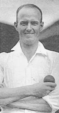 O'Reilly was the leading Australian bowler of the tour, taking 28 Test wickets at an average of less than 25, while Grimmett took 25 wickets at just under 27 runs apiece. Australia's other Test bowlers took only 18 wickets between them. On the tour as a whole, O'Reilly headed the tourists' averages, with 109 wickets at 17.04, which meant that he also topped the averages for the whole English cricket season.[75] In the matches against the English counties, he took 11 wickets in each of the games against Leicestershire and Glamorgan, and in the match against Somerset, after Hans Ebeling took the first wicket, he took the remaining nine for 38 runs, and that proved to be the best innings figures of his career.[76] He was named as one of the Wisden Cricketers of the Year in 1935 for his deeds on tour.[1]