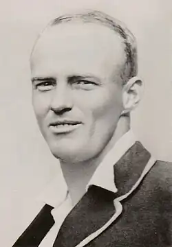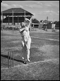 O'Reilly won a scholarship to the Sydney Teachers College at the University of Sydney, to train as a schoolmaster. However, the financial assistance was only for two years and merely sufficient for O'Reilly's rent at Glebe Point.[25] When he was in Sydney, O'Reilly received an invitation to join an athletics club based on his performances in Goulburn, but was only able to join after the secretary Dick Corish waived his membership fee.[26] Jumping 47 feet, he came second in a triple jump competition behind Nick Winter, who went on to win gold in the event at the 1924 Summer Olympics with a world record of 50 ft. O'Reilly also placed second in a high jumping competition, clearing six feet.[26][27] Corish was also a cricket administrator and invited O'Reilly to play in a David Jones Second XI. Not knowing anything of his new recruit's abilities, Corish did not allow O'Reilly to bowl until he explicitly complained of only being allowed to field.[26] O'Reilly promptly finished off the opposition's innings by removing the middle and lower order.[26] After an encounter with journalist Johnny Moyes, who wrote glowingly about O'Reilly's skills.[13]