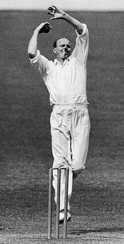 In the Second Test in Melbourne, O'Reilly opened the bowling as Australia opted to use only one pace bowler on a turning pitch.[54] After Australia had made only 228, O'Reilly trapped Bob Wyatt leg before wicket (lbw) before bowling both the Nawab of Pataudi and Maurice Leyland to leave England at 4/98. He later took two tail-end wickets to end with 5/63 and secure Australia a first innings lead. Defending a target of 251, O'Reilly bowled the leading English opener Herbert Sutcliffe for 33 with a textbook perfect leg break that pitched on leg stump and clipped the top of the off stump. According to English team manager Plum Warner, Sutcliffe had never been defeated so comprehensively. O'Reilly also removed Hammond on the way to ending with 5/66 and securing a 111-run win.[55][56][57] The ten-wicket haul was O'Reilly's first at Test level and the start of his strong career record over the English.[54] However, Australia were not to taste further success. The controversial "fast leg theory" bowling used by England under newly appointed captain Douglas Jardine brought the touring team victories in the last three matches: Australia were handicapped not only by the tactics, but also by a lack of quality fast bowlers; O'Reilly also opened the bowling in both the Third and Fourth Tests in Adelaide and Brisbane respectively due to the selection of only one paceman. He was hindered by a decline in the form of Grimmett, who was dropped after the Third Test.[50][58] O'Reilly took 2/83 and 4/79 in Adelaide, collecting the wicket of Sutcliffe for single figures in the first innings of a match overshadowed by near-riots after captain Bill Woodfull was struck in the heart.[59] Australia were crushed by 338 runs, and lost the series in Brisbane. After O'Reilly had taken 4/101—including Sutcliffe and Jardine—in the first innings to keep Australia's first innings deficit to 16, the hosts collapsed to be 175 all out. O'Reilly took one wicket in the second innings of a six-wicket loss.[60] The final Test in Sydney took a similar course; O'Reilly took 4/111 in the first innings including Sutcliffe and Jardine again, as the tourists took a 14-run lead before completing an eight-wicket win after another Australian collapse. O'Reilly was wicketless in the second innings and bowled 72 overs in total in the match. Reflecting on the performance of O'Reilly in the series, R Mason said "here we saw the first flexing of that most menacing genius".[61]