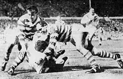 Boston tackling Wakefield Trinity player Gert Coetzer during the 1962-63 Challenge Cup final