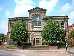The hospital expanded rapidly. By 1845 separate wards were added containing 28 beds for infectious and contagious disease cases, raising hospital capacity to 98. In 1867, adjacent grounds to the west were purchased, and in 1871, Lord Leigh laid the foundation stone for a new outpatient department, originally known as the "Workmen's Extension" as it was funded by local working people, to the strains of a hymn written for the occasion by the Rev. Charles Kingsley and sung by 1,000 child choristers from the Birmingham Schools Choral Union.[5] This building was designed by Martin & Chamberlain and is also Grade II listed.[6] It opened for patients on 7 November 1873.[7]