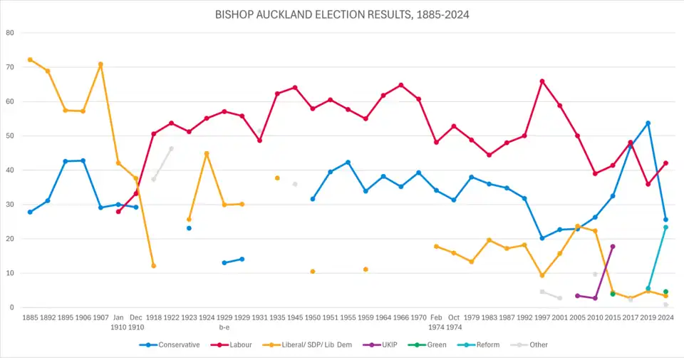 From 1935 to 2017 inclusive, the seat's voters returned MPs from the Labour Party; the former Labour Chancellor of the ExchequerHugh Dalton, was the MP for Bishop Auckland from 1929 to 1931, and after regaining the seat in 1935, remained an MP until 1959. The 2019 result returned a Conservative; the party's results had shown an increase from election to election from 2001 onwards, going from 20% of the vote in the previous 1997 election to a majority of votes at 53% in 2019. However, this was reversed in 2024 when the Conservative vote dropped back down to 25.6% and Labour regained the seat.