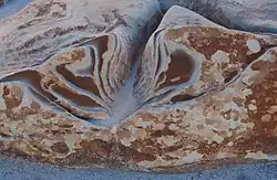 The Kirtland Formation was deposited shortly after the Fruitland Formation, and consists of thick greenish shales and siltstones, with just a few thin coal beds and white sandstone beds. The lower part of this formation is called the Hunter Wash Member and is bounded by a white sandstone bed at its base and a distinctive brown sandstone bed (the Bisti Bed) at its top. Between is drab green siltstone. The middle part of this formation is called the Farmington Sandstone which consists of brown-topped sheets of sandstone. The upper part of the formation is called the De-na-zin Member and is similar to the Hunter Wash Member, but with purple beds near its top.[8] The sandstone of the Farmington Member reflects a time of uplift somewhere nearby, producing high ground from which coarse sediments were eroded. Dinosaurs and other fossils are found scattered throughout the Kirtland Formation.[7] Some 200 species of plant or animal fossils have been identified in the combined Fruitland and Kirland Formations, most of which are found in the Bisti/De-Na-zin Wilderness. The plant fossils include petrified logs, leaf impressions, and carbonized leaves.[8]