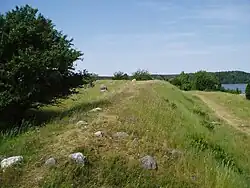 Birka settlement originated around 800 AD on the shores of the strait separating Björkö and Adelsö, today a pasture-ground known as Bystan covering some 12 ha. The area is still delimited by the ancient defensive earthwork, which once must have stretched farther south to the hill fort at Borgberget. In the water adjacent to Birka are the remains of poles believed to have served as a naval defense line. Around the earthwork three large burial grounds belonging to Birka have been found. The north-easternmost and largest is Hemlanden with some 1,600 graves; south of Birka are two smaller burial grounds: Borgs hage with 250 graves and Kvarnbacka with 185 graves. Approximately 1,100 of the 2,000 Birka graves have been excavated.[4] The archaeological finds from the excavations are held by Swedish Museum of National Antiquities in Stockholm.