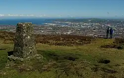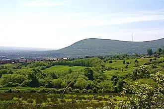 Black Mountain is a large hill which overlooks the city of Belfast, Northern Ireland. With a height of 1,275 ft (389 m),[1] it towers over most of west Belfast and is part of the Belfast Hills. Its name is probably derived from the adjoining mountain called Divis (/ˈdɪvɪs/; from Irish Dubhais 'black ridge'), and they may have been seen as one mountain in the past.[2] Black Mountain transmitting station is on the summit.