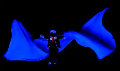 The effect of black light theatre allows invisible performers to move visible props, turning the objects into independent participants in the theatre at the same level as the human actors.[2] Furthermore, the appearance of objects and actors in a performance can be sudden and can occur anywhere on stage, even within a few meters of an audience member.[11] In order to achieve this effect it is necessary to create an intense field of UV light throughout the entire playing space. Because the intensity of light emitted from a typical 'black light' source diminishes significantly with increased distance from the source, covering an entire theatre space with UV light requires either that the 'black light' sources be spaced as close as one meter apart or emit much more light than a typical 'black light'.[21] Another important consideration is that, since most of the space is completely dark, and the form is heavily dance based, a single wrong move by a single performer can negatively impact the entire production. For this reason performers train extensively specifically for the black light theatre environment.