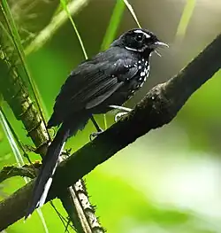 This is a medium-sized, long-tailed bird measuring 18-19 cm and weighing 18-19 g.[2] The plumage is blackish with white spots on the chest and wings and a white tip to the tail. There is besides a short white stripe above the eye and white spot on the side of the neck. The tail is often lifted and fanned out.[3] The iris is dark brown, the beak is black with pinkish underside. Males and females are similar but females have fewer spots and are paler on the abdomen. Juveniles are sooty black all over except for an indistinct white supraorbital spot and white tips on the tail feathers.[2]