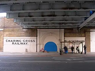 The former entrance to the South Eastern Railway Blackfriars station under the railway bridge on Blackfriars Road itself is still clearly visible.[2] In 2005 the bricked-up former street-level entrance and original wording were restored. At track level, widening of the viaduct on its north side is the only indication of its site. In July 2009 planning permission was granted for a café to be built over the entranceway to the station.[3]