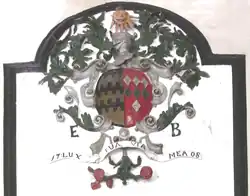 Edward Blount (died 1726) of Blagdon, third son, who inherited his maternal estates. As a Roman Catholic he was associated with the Howard family, Dukes of Norfolk, the leading Catholic family in England. On 6 June 1716, together with Lord George Howard, (died 1721), the eldest half-brother of Henry Howard, 7th Duke of Norfolk (1655-1701), he "successfully petitioned the House of Lords for counsel to argue against provisions in the Papists' Estates Bill, read 18th May 1716, which threatened to ruin their credit".[30] Shortly thereafter Edward Blount went into exile with his family in Bruges, but had returned to England by 1721. In 1708 Edward Blount married Anne Guise, a daughter of Sir John Guise, 2nd Baronet (c. 1654–1695) of Elmore in Gloucestershire, which marriage was commemorated by the surviving heraldic overmantel above the fireplace of the great hall of Blagdon manor house. This shows the initials "EB" [31] and displays the arms of Blount (Barry nebuly of six or and sable) impaling Gules, seven mascles vair 3,3,1 (Guise) above a scroll inscribed with a Latin motto Lux Tua Via Mea ("Your light is my path") with the date "1708". In 1717 "Edward Blount of Blagdon" registered his landholdings under the Registration of Papists' Estates,[32] legislation passed following the Jacobite uprising of 1715. Edward Blount was a friend and patron of the poet Alexander Pope (1688-1744),[33] and much correspondence between the two men during the years 1714-25 survives.[34] Both were Roman Catholics.[35] Edward Blount left three daughters as his co-heiresses: