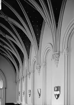 A blind arch is an arch found in the wall of a building that has been infilled with solid construction and so cannot serve as a passageway, door or window.[1] The term is most often associated with masonry wall construction, but blind arches are also found (or simulated) in other types of construction such as light frame construction. Some blind arches were originally built as open arches and infilled later. Others were originally built with solid infill as intentional stylistic elements (multiple arches form a blind arcade).
