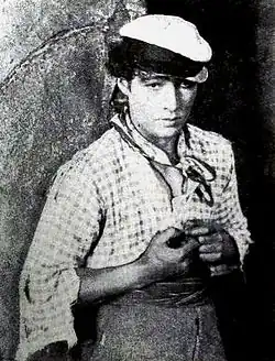 In August 1922, Cal York (pseudonym, for California and New York) of Photoplay commented on the actor's appearance in the above film still: "...is Rodolph Valentino wearing a wig in 'Blood and Sand,' or did he permit his slick hair to be coiffed into the curly mop you see under this Spanish cap? Cheer up—it's only temporary. Later on in the picture he looks more like Julio."[5] By "Julio", York is referring to Valentino's character in The Four Horsemen of the Apocalypse, who has slicked-back hair.
