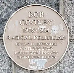 Bob Cooney died in Aberdeen on 15 August 1984 at the age of 76.[5][10] and a concert was held in his honour at Aberdeen Arts Centre on 16 August 1986, with Ian Campbell and Dick Gaughan among the performers.[11][12] He has a gold plaque in Castlegate and, in 1997, the residential area Bob Cooney Court in Berryden was named in his honour.[13][14] A posthumous autobiography, Proud Journey: a Spanish Civil War memoir, was published by the Marx Memorial Library in October 2015.[15]