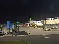 Three jet bridges protude above a seven-bay concrete apron. The apron is capable of handling four parking bays for wide-body aircraft as large as the Boeing 777 and Airbus A330 or a maximum of seven parking bays for narrow-body aircraft like the Airbus A320 and A321.[13]