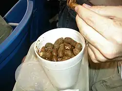 Boiled peanuts are widely consumed and commercially available in an area of the Southern United States from North Carolina, south to central Florida, as far north as Ohio, and west to Mississippi.[1] The peanuts are sold in the hull and boiled with only salt or with a piquant spice mixture such as Old Bay or Zatarain's. The latter are often called "Cajun boiled peanuts" in many recipes.