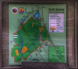 Bond Swamp National Wildlife Refuge, located 6 miles (10 kilometers) south of Macon, Georgia, United States, was established in 1989 to protect, maintain and enhance the forested wetland ecosystem of the Ocmulgee River floodplain. It opened to the public in 2000 and consists of 8,600 acres (3,500 hectares) situated along the fall line separating the Piedmont and Coastal Plains. The acquisition boundary established in 1999 includes around 17,000 acres, though the Fish and Wildlife service has been unable to acquire much private land.[1] The refuge has a diversity of vegetation communities, including mixed hardwood-pine, bottomland hardwoods, tupelo gum swamp forests, creeks, tributaries, beaver swamps and oxbow lakes. The refuge is rich in wildlife diversity including white-tailed deer, wood ducks, black bears, alligators, wild turkey, a nesting pair of bald eagles and excellent wintering habitat for waterfowl. Extensive bottomland hardwoods provide critical habitat for neotropical songbirds of concern, such as Swainson's warbler, wood thrush, prothonotary warbler and yellow-billed cuckoo. The combination of warm weather and wet areas at Bond Swamp provide ideal conditions for a variety of reptile and amphibian species.