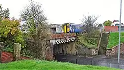 A train bound for Kilmarnock passes through Bonnyton at Bonnyton Road