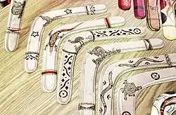 Another use for boomerangs are in formal dance ceremonies, used both as percussion instruments (like clapsticks) and by dancers. Styles and decorations varied widely among clans and different Aboriginal groups across Australia, and were significant in the ceremonies.[25]